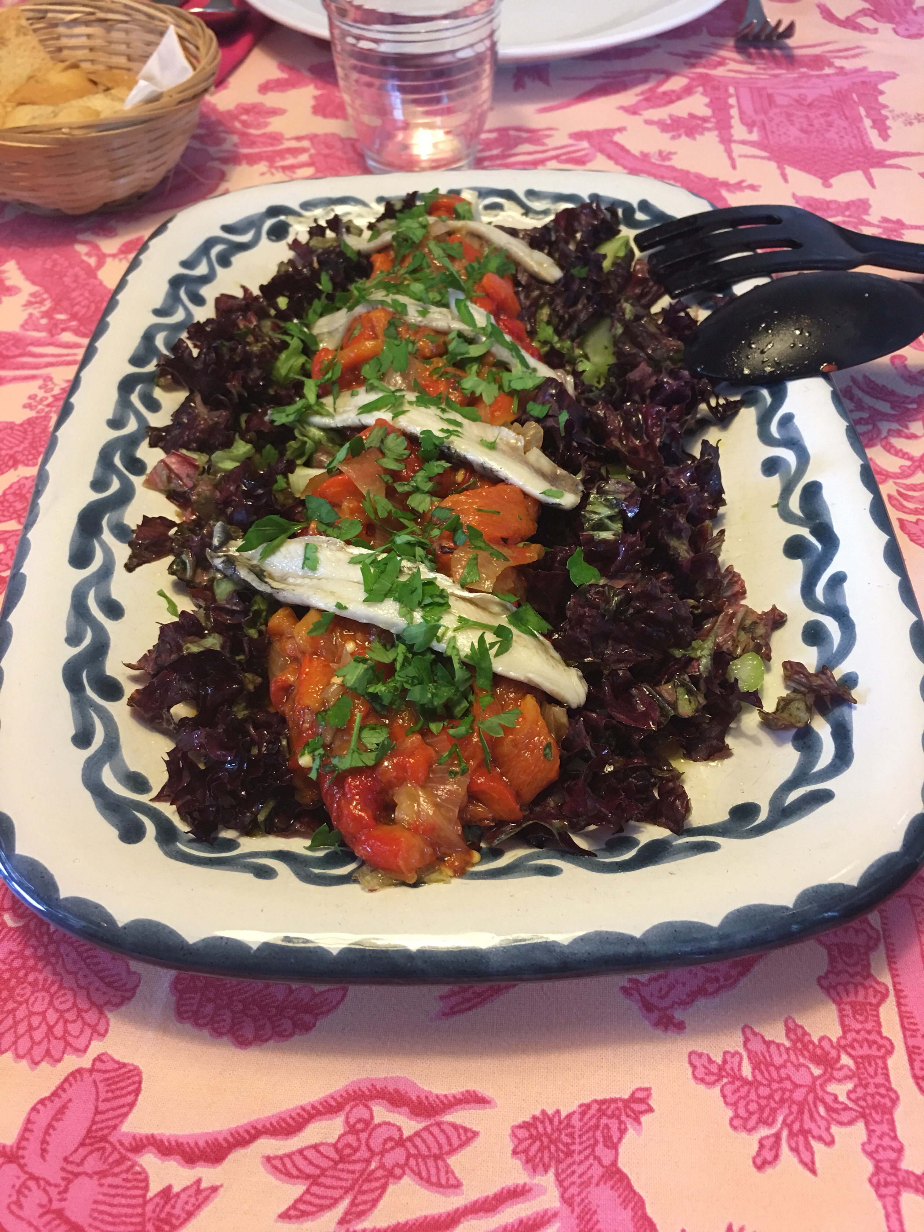 Lunch was another feast that I somehow could not resist despite still feeling very off colour. A salad made of roasted peppers and anchovies