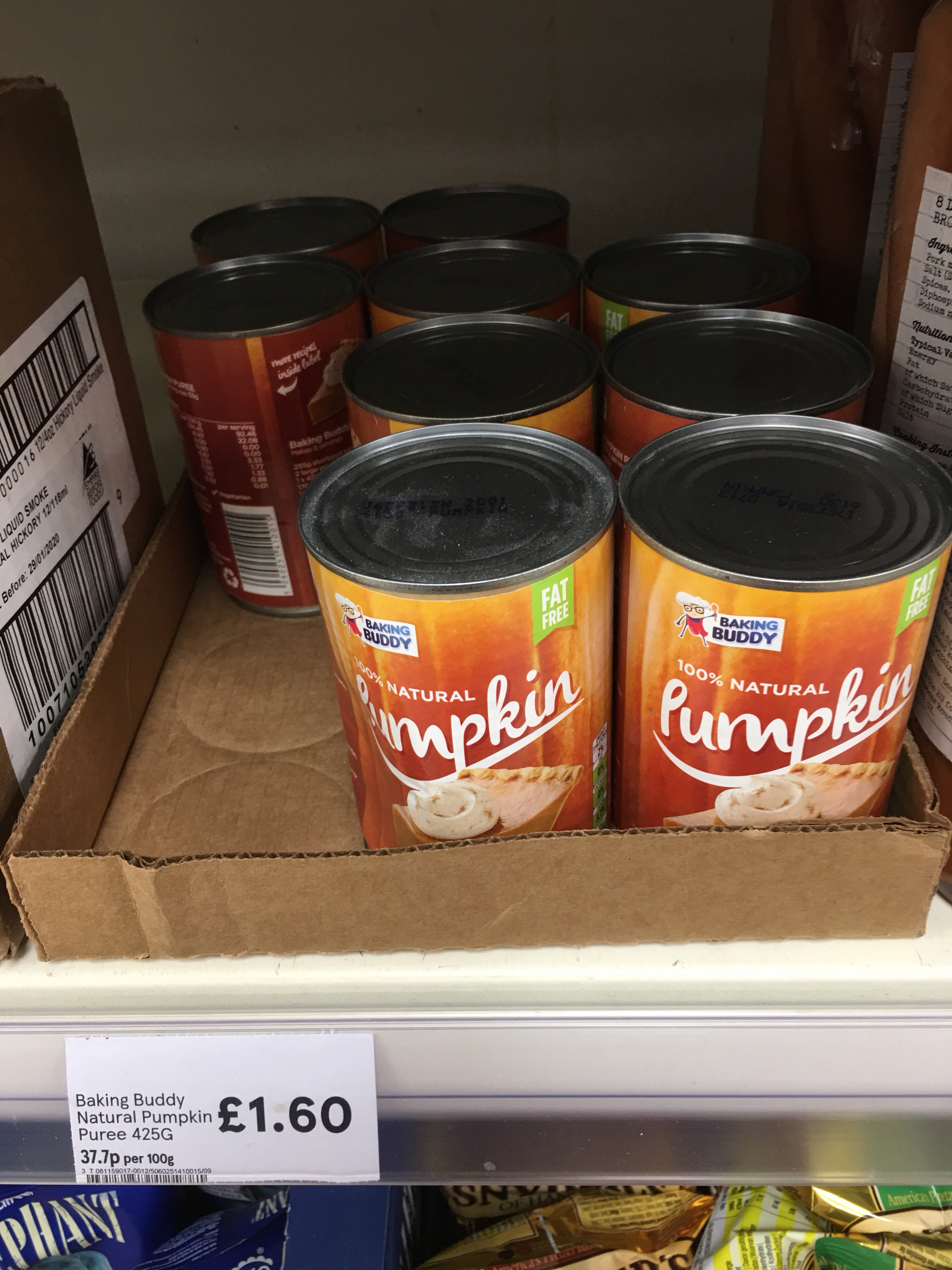 In the meantime, I posted an obligatory picture on Instagram and Facebook with a little comment on how I struggled to find even a whiff of pumpkin and one of my old colleagues told me where I could find it. Therein ensued a conversation about various stores and locations in which pumpkin puree could be found. In the end I found myself leaving Tesco in Goodmayes a very happy lady with two tins of pumpkin puree – result.