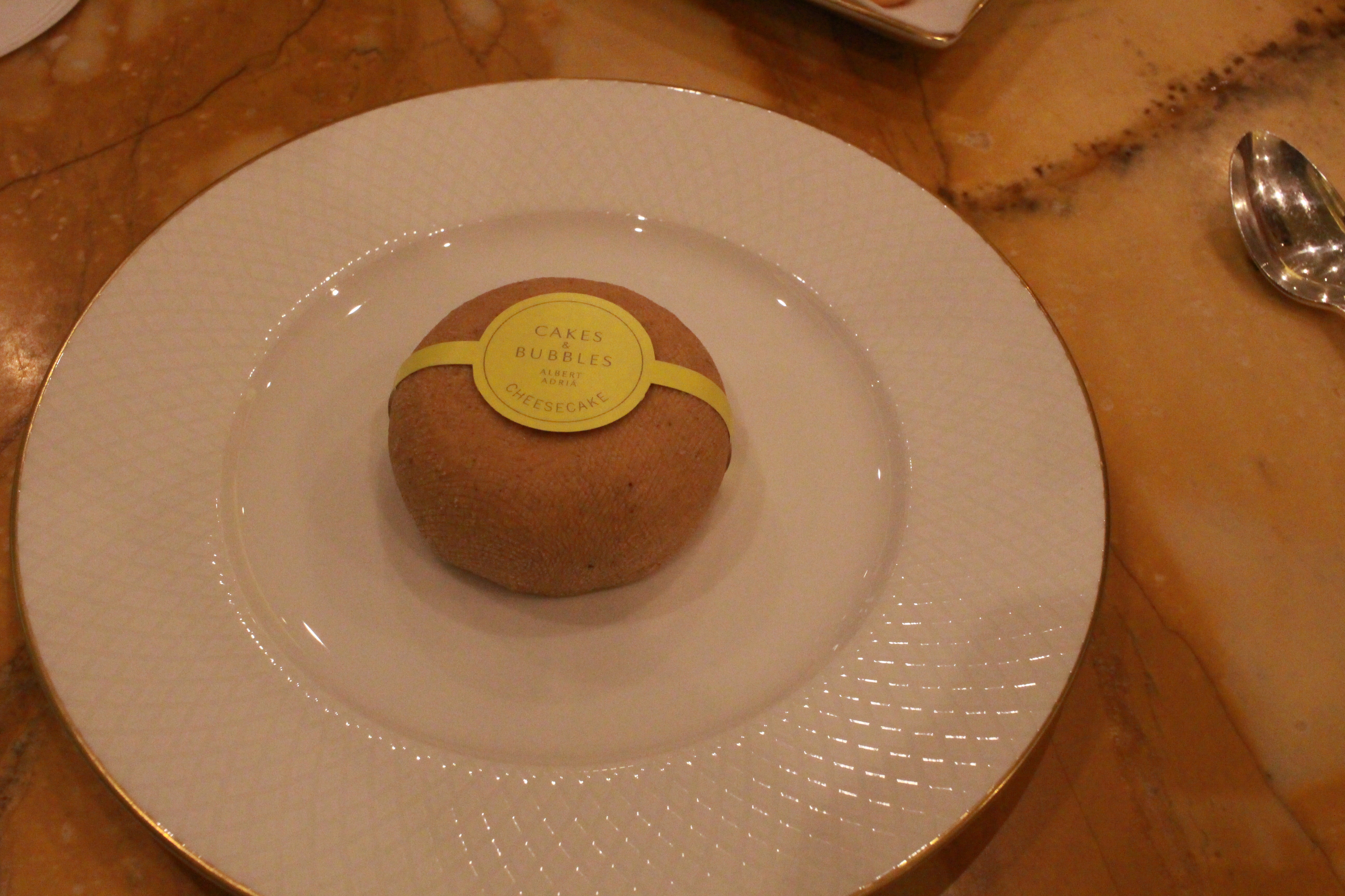 The last thing on the menu was Albert Adrià’s signature cheesecake. This is presented as a miniature wheel of cheese, tied up in a branded ribbon. It contains coulommiers cheese wrapped in a shell of hazelnut and white chocolate. This makes for an intensely sweet and savoury combination that bounces around the mouth in just the most pleasant way.