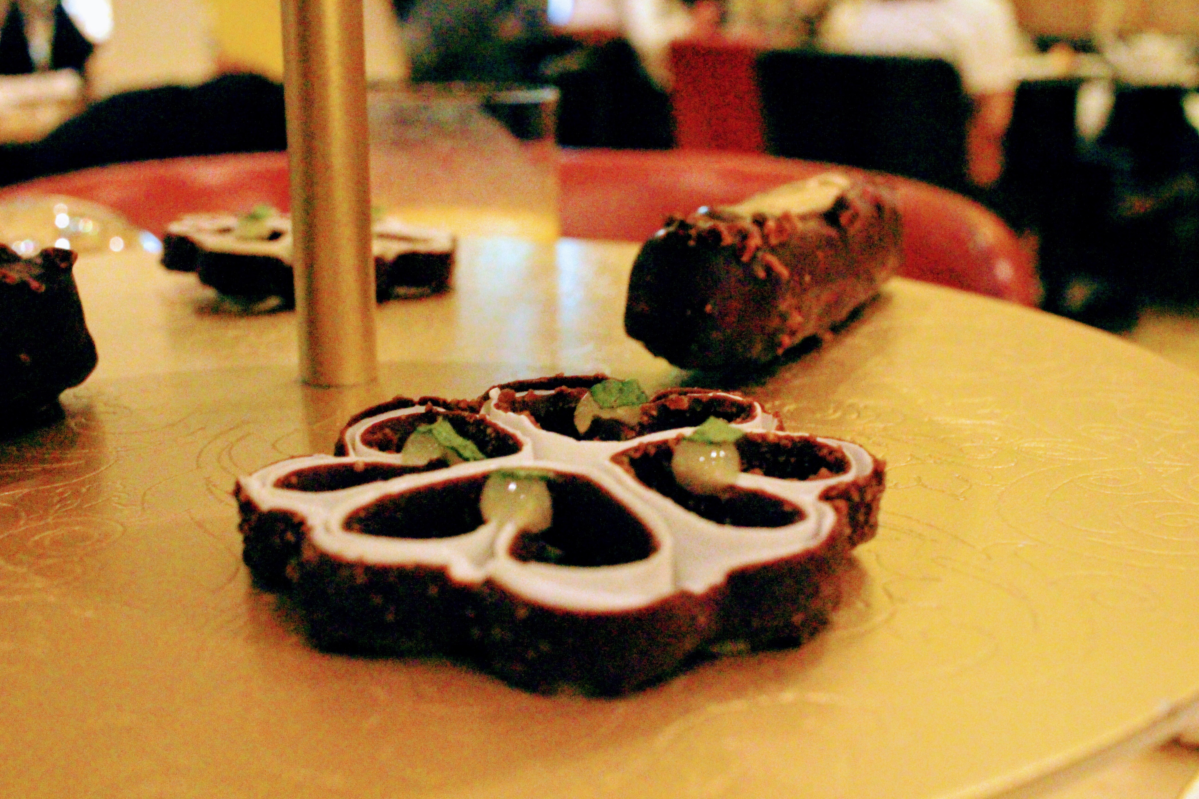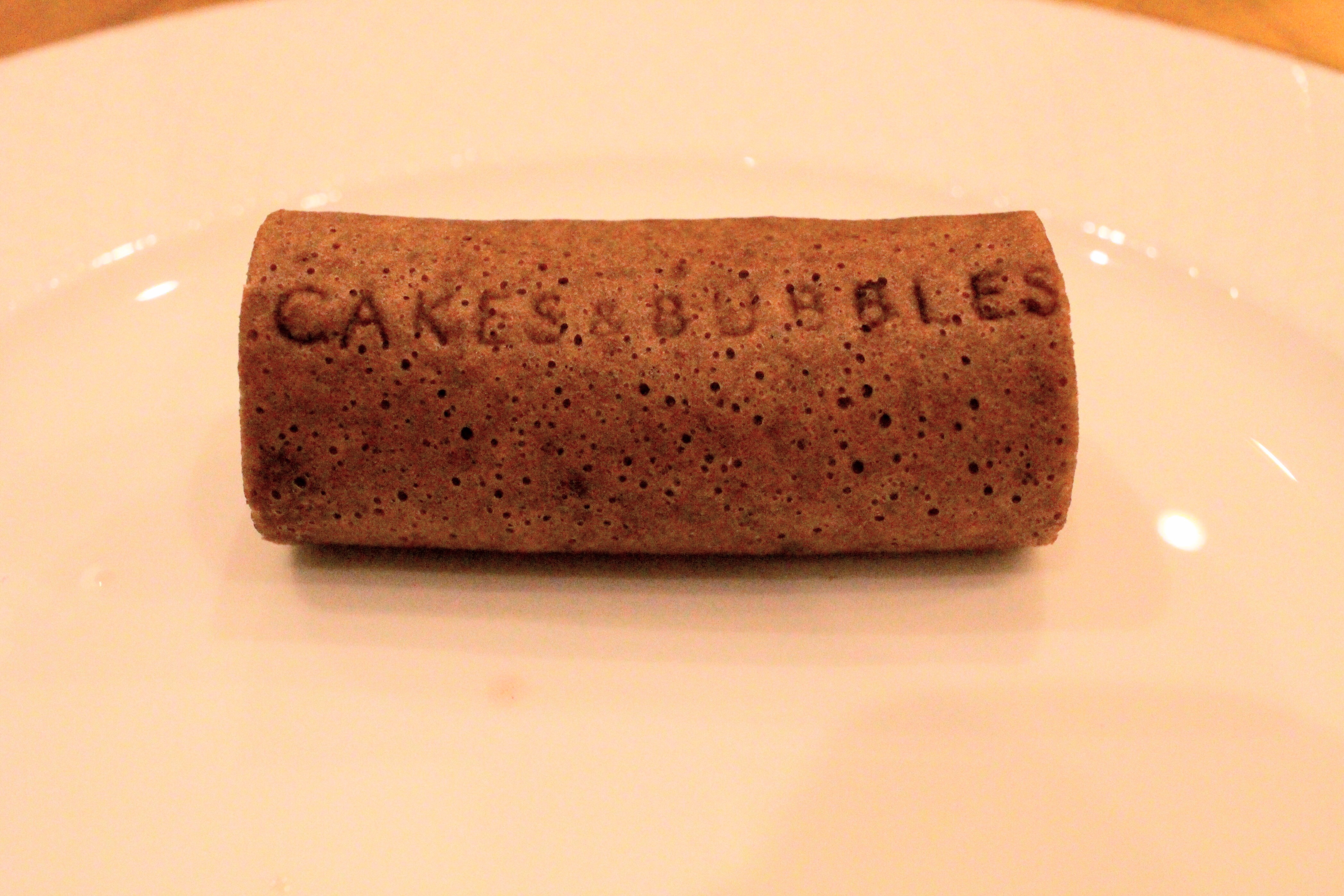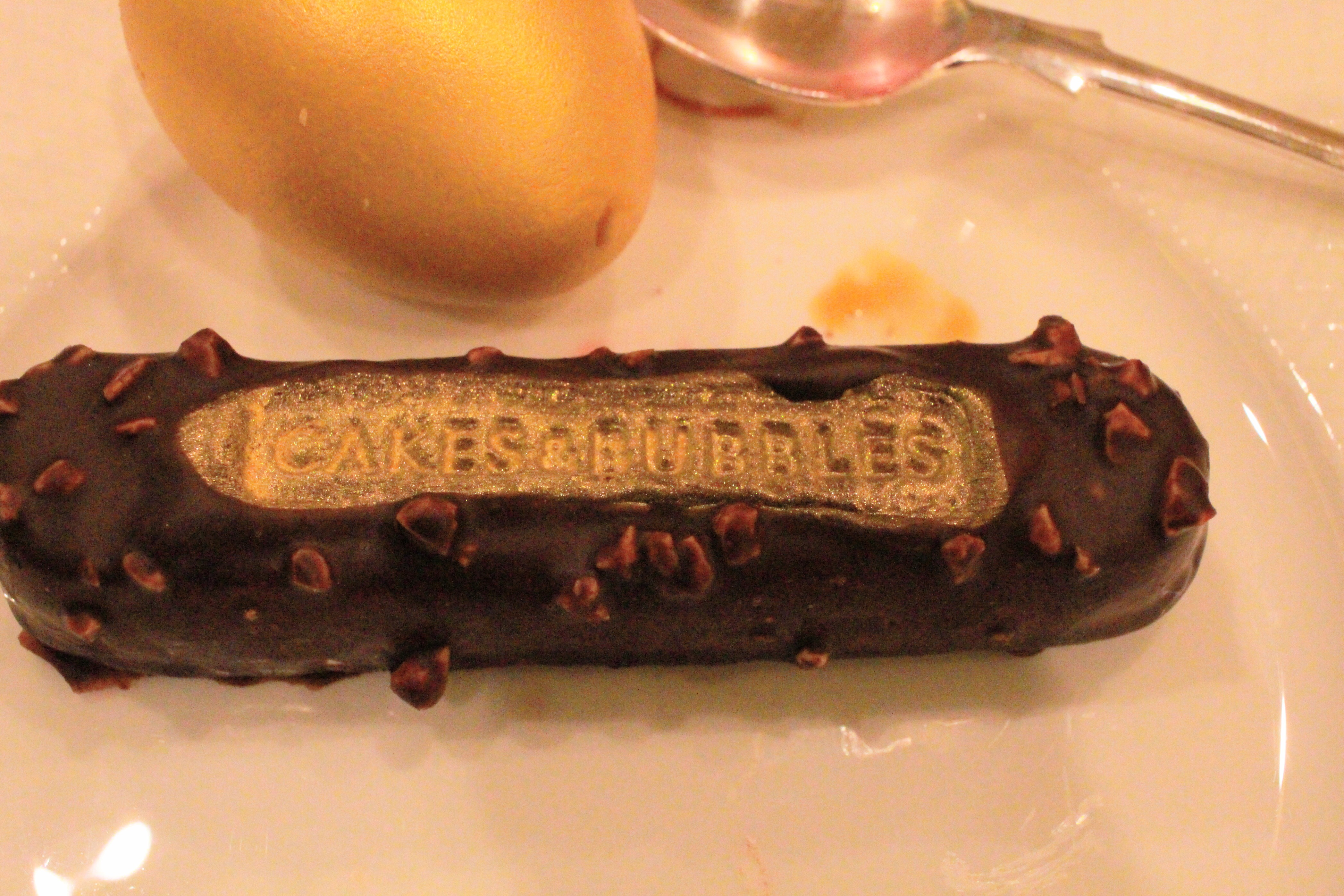 The first item we sampled was the edible ‘cork’ branded with Cakes & Bubbles name. It has the resemblance of a miniature swiss roll, with a hollowed-out, coffee-flecked sponge filled with frozen chocolate ice cream. When I looked around me at the other people who has this as a single dessert I noticed that it was presented on a bottle of Champagne that has been cut in half, decadent, but why not?