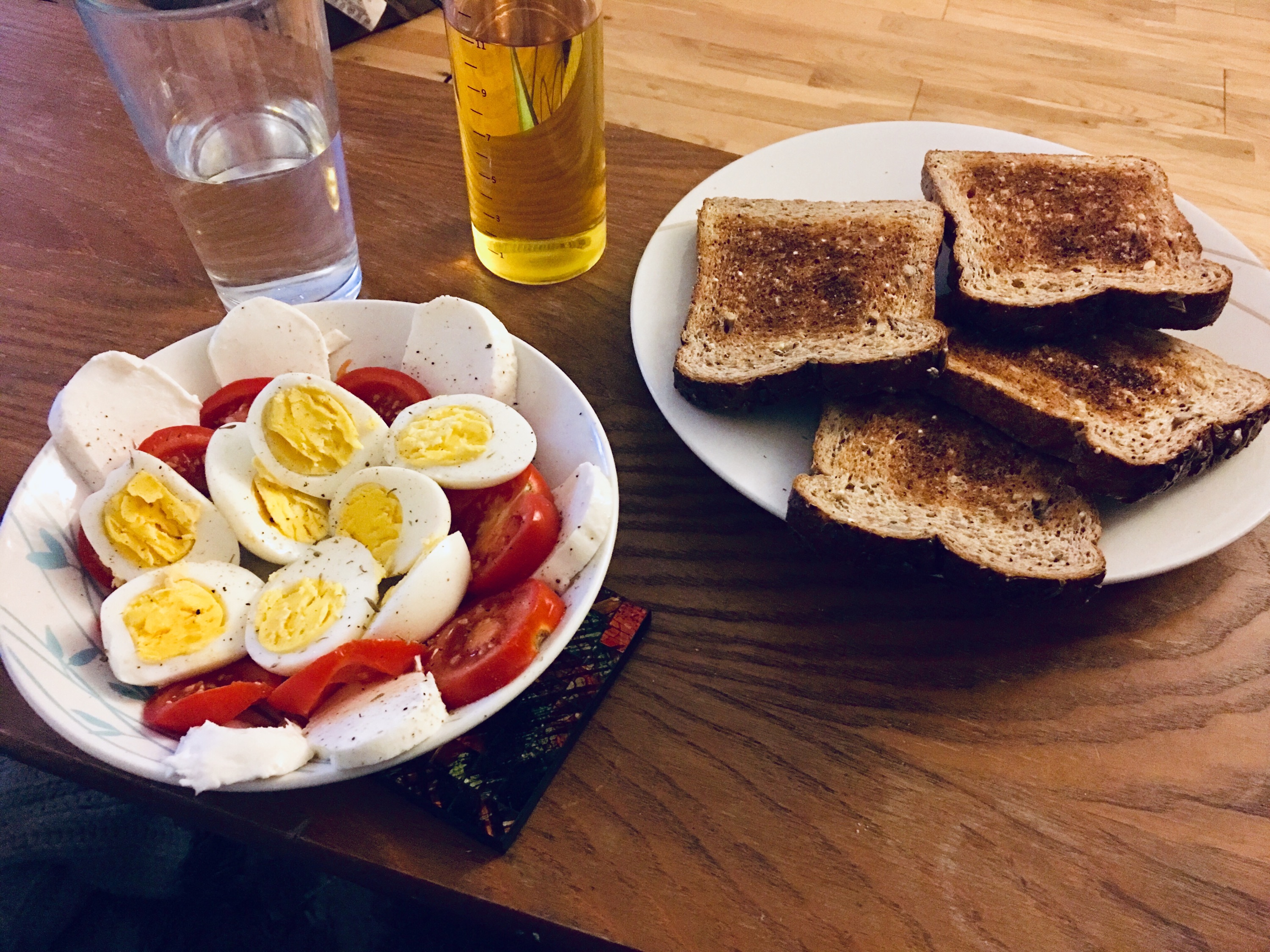 Nacho and I were snuggled up on the sofa watching another Netflix documentary on food (Salt Fat Acid Heat). I decided a little snack was in order to get us through the last mouthwatering episode. I rummaged around in the kitchen and ended up with boiled eggs, mozzarella and tomato. I toasted four slices of bread and brought in the olive oil. Hey presto we had all the ingredients for an impromptu sandwich construction. It goes without saying that it was very tasty!