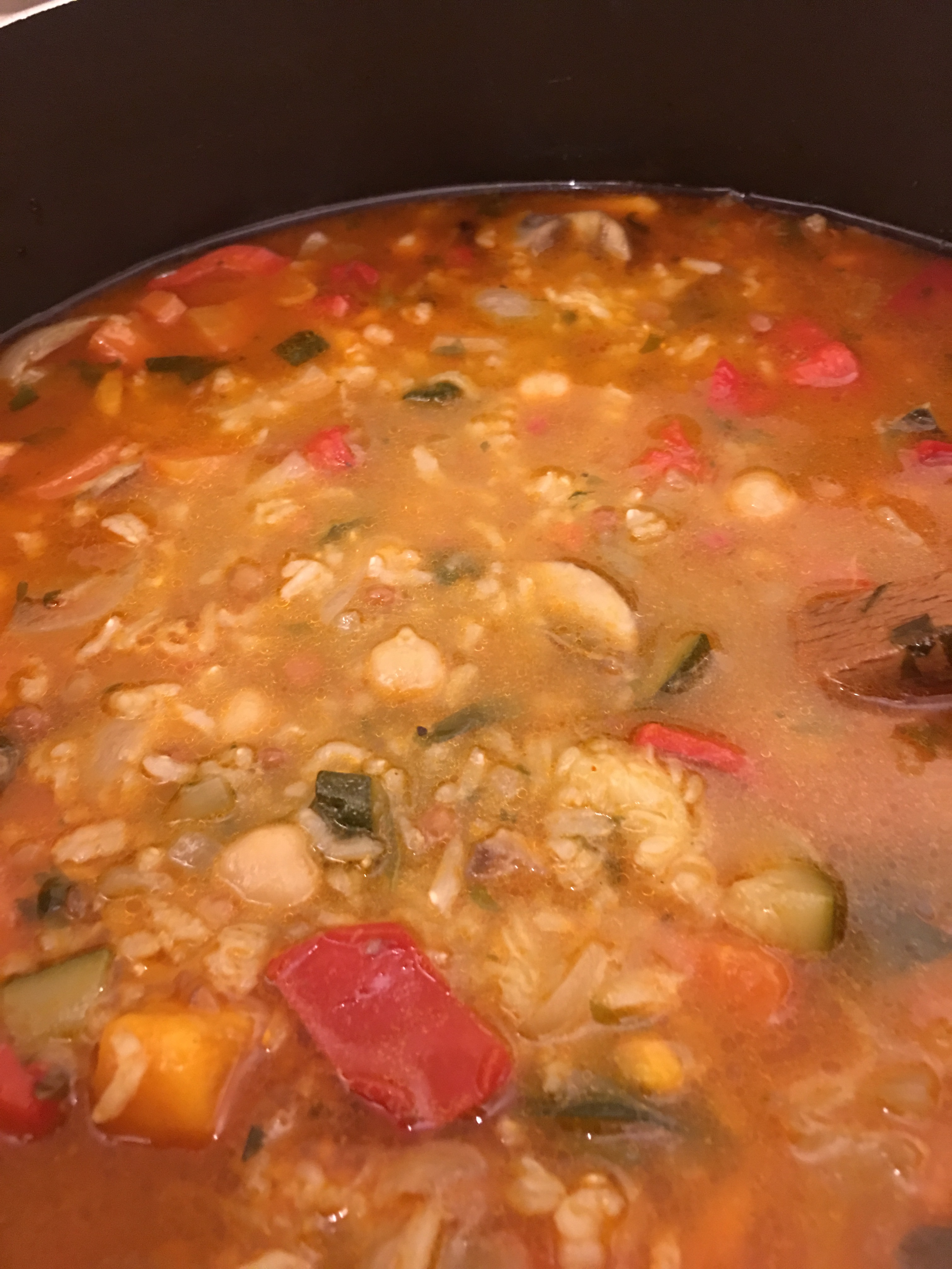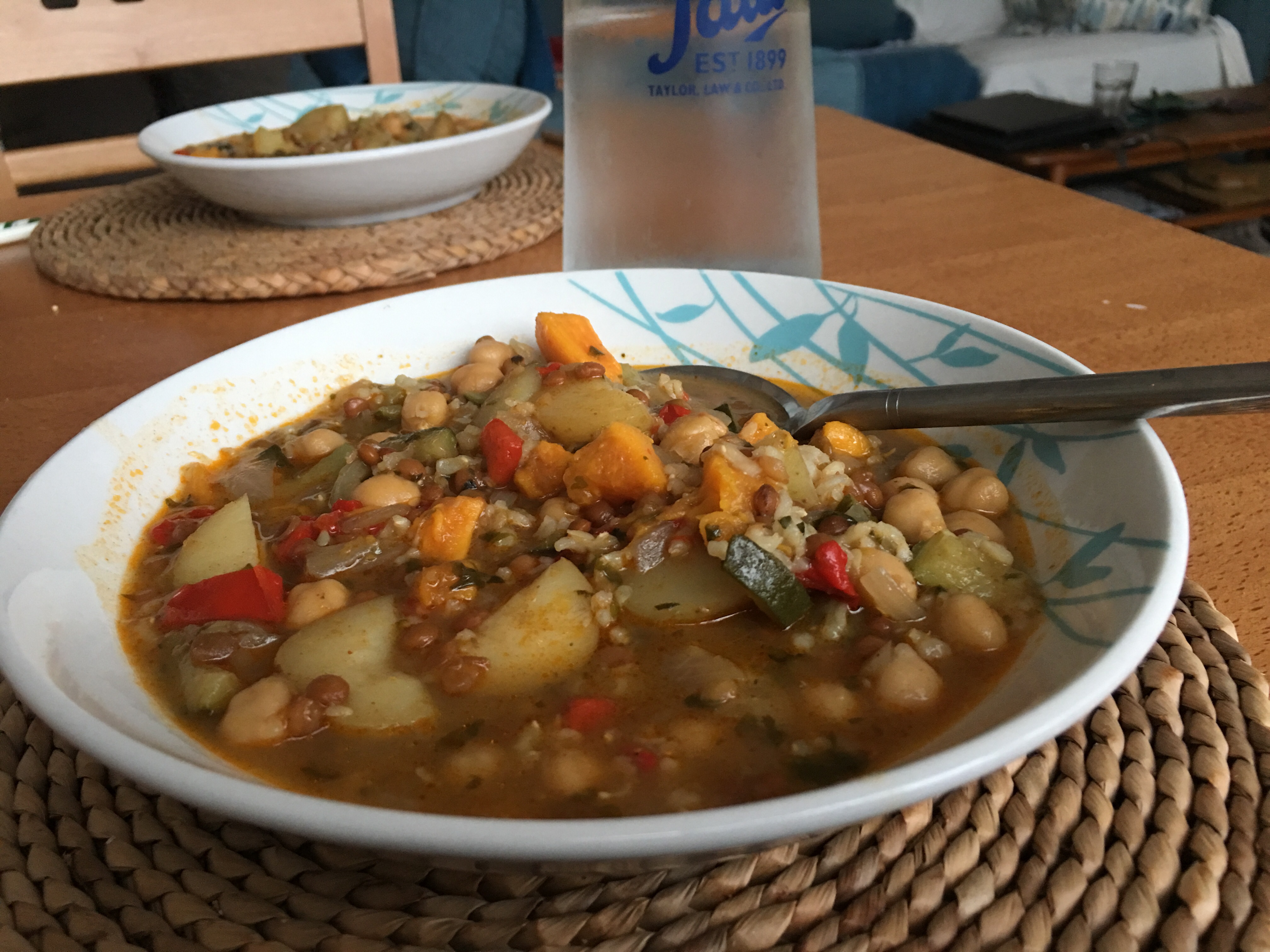We got home and I started on my now regular Sunday evening stew. Essentially I chop up all the vegetables I can find hiding in the fridge and vegetable bowl, I add two generous pinches of salt and I let them cook until soft in some olive oil. Then I add just until a litre of vegetable stock, a cup full of rice, a packet of chick peas, a packet of green lentils, 2 bay leaves, eight cloves (yes…no more and no less) and a tablespoon of paprika. I let this mixture cook for an hour, then leave to settle for 30 minutes and then serve. There is usually enough left over to freeze down and eat for lunch over the following week. This stew is really comforting, it’s so tasty and I feel great because I made it myself. It’s a nice feeling.