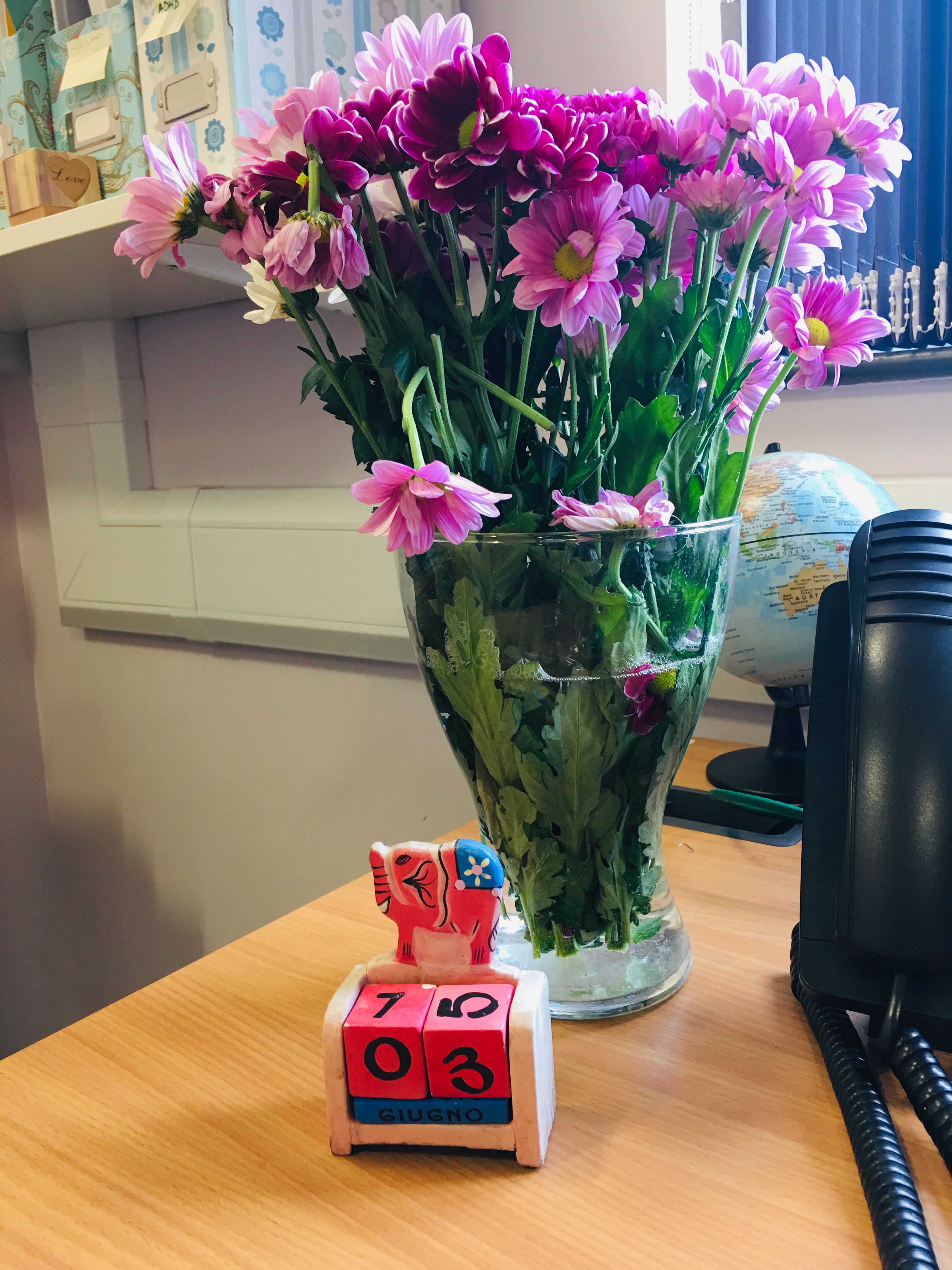 I had read an article on burnout over the weekend and one of its suggestions, improve the work situation, save leaving the job, was changing the work environment. I decided that this morning, while I chip through my tasks and clinic letters, I would like to look at some flowers. I bought a bunch of Chrysanthemums from the petrol station where I filled up the car. They are pretty and have improved my mood greatly.