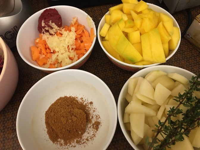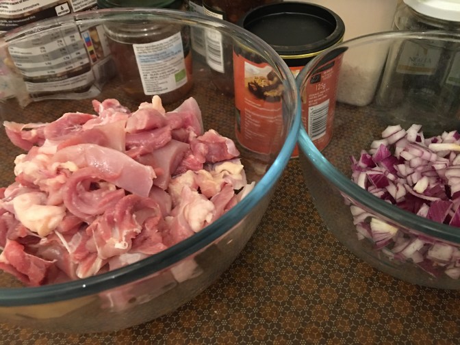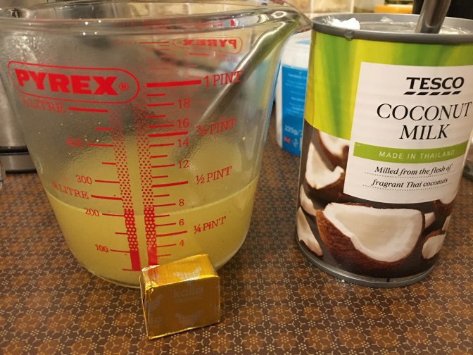 So with this new found energy and positivity, this Saturday, I finally got round to making the chicken and mango curry I have been wanting to make for a while (yes – my vegetarian days are well and truly over, for now). The recipe is not difficult and the ingredients are easy to source, most of which I had in my kitchen cupboards, apart from the chicken stock, tomato purée, thyme, chicken and ginger.