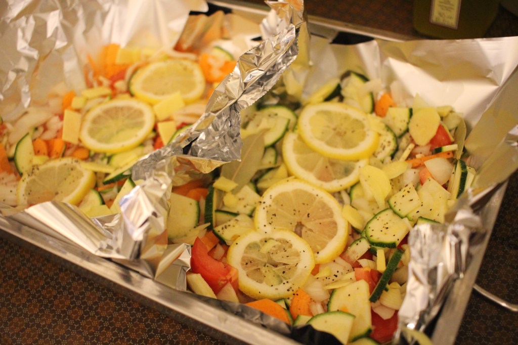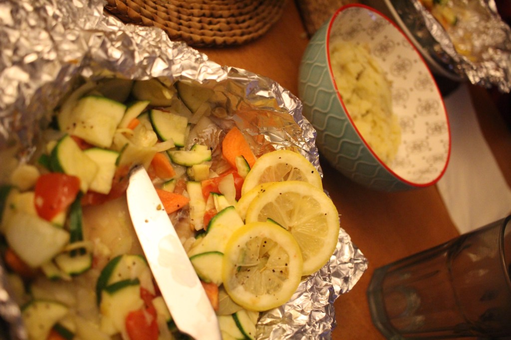 Always looking for new ways to eat the same food, I decided on Friday evening, to surround white fish fillets with vegetables, lemon slices, salt, pepper, garlic, ginger and white wine, bake in a foil package for 30 minutes and see what happened. On the side I boiled and then mashed some potatoes with olive oil and salt.