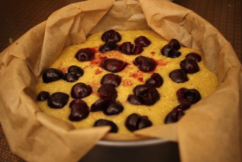 Remove the stones from the cherries – you can do this with a cherry stoner or by just pulling them apart and popping the stones out with your fingers. I like to do this over the cake tine, so that any juice drips onto the cake and adds colour.