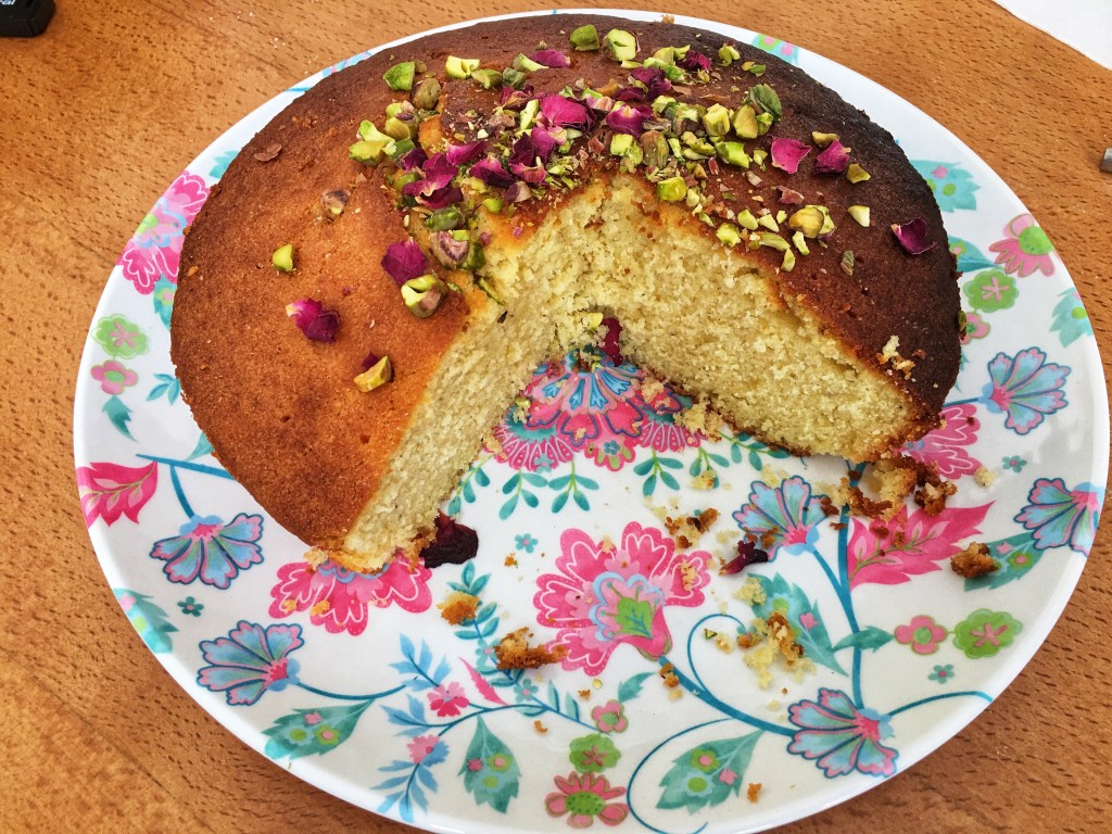 I made my own birthday cake. A modified version of the persian love cake I made a few weeks ago. I added less rose water. I did not have enough ground almond so I converted to a pseudo sponge cake. I used crushed cardamon pods instead of cardamon powder. I omitted the icing, and used a lemon and rose water drizzle.