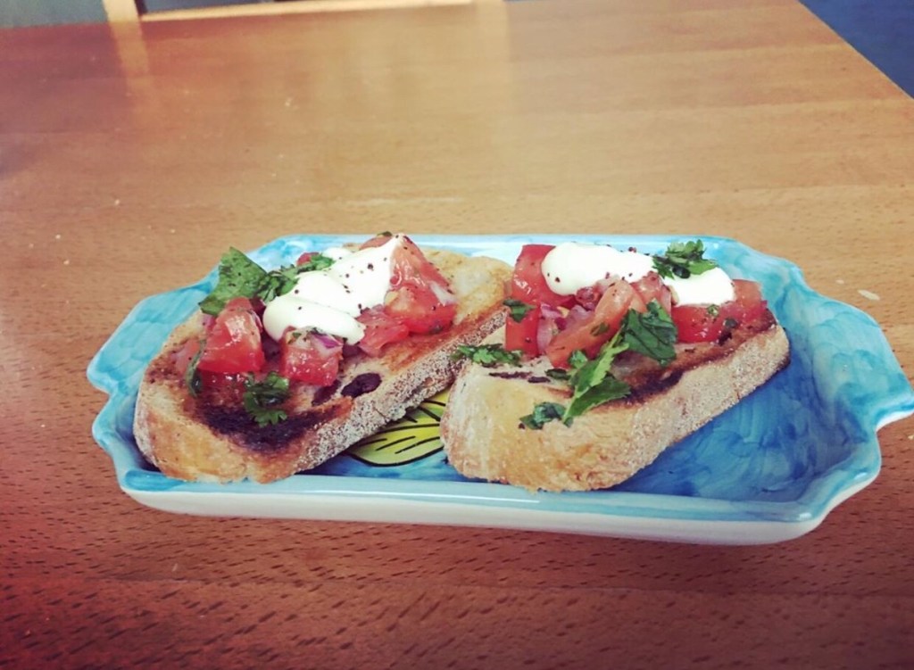So I thought I would start with a little snack not dissimilar to bruschetta. It was very easy to make. I did not have Greek yoghurt or labneh so I used sour cream instead.