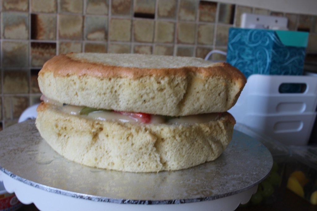 Essentially, I was making a light sponge cake, with home made fresh custard and fresh fruit sandwiched between the layers, surrounded by fresh whipped cream and topped with more fresh fruit. At first the instructions, just because of the sheer volume, looked overwhelming. However once you break it down, it’s pretty simple. Make the sponge cakes, make the custard, make the whipped cream, prepare the fruit and then assemble the cake.