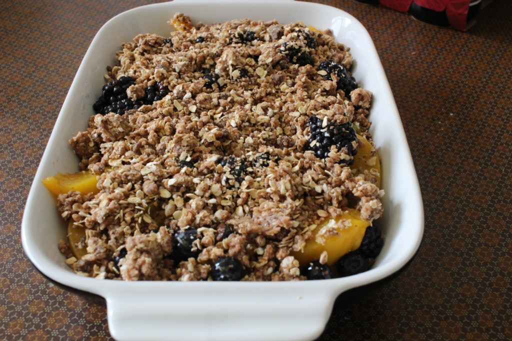 However there is still food to be cooked, that never really changes. Today I wanted to use up the berries (blue and black) that have been lurking in the fridge for a while. I thought the best way might be to make a crumble. It feels like we are in that season now, also I need something sweet to eat with my coffee! I also had a can of tinned peaches in the cupboard which have also been crying out to be eaten.