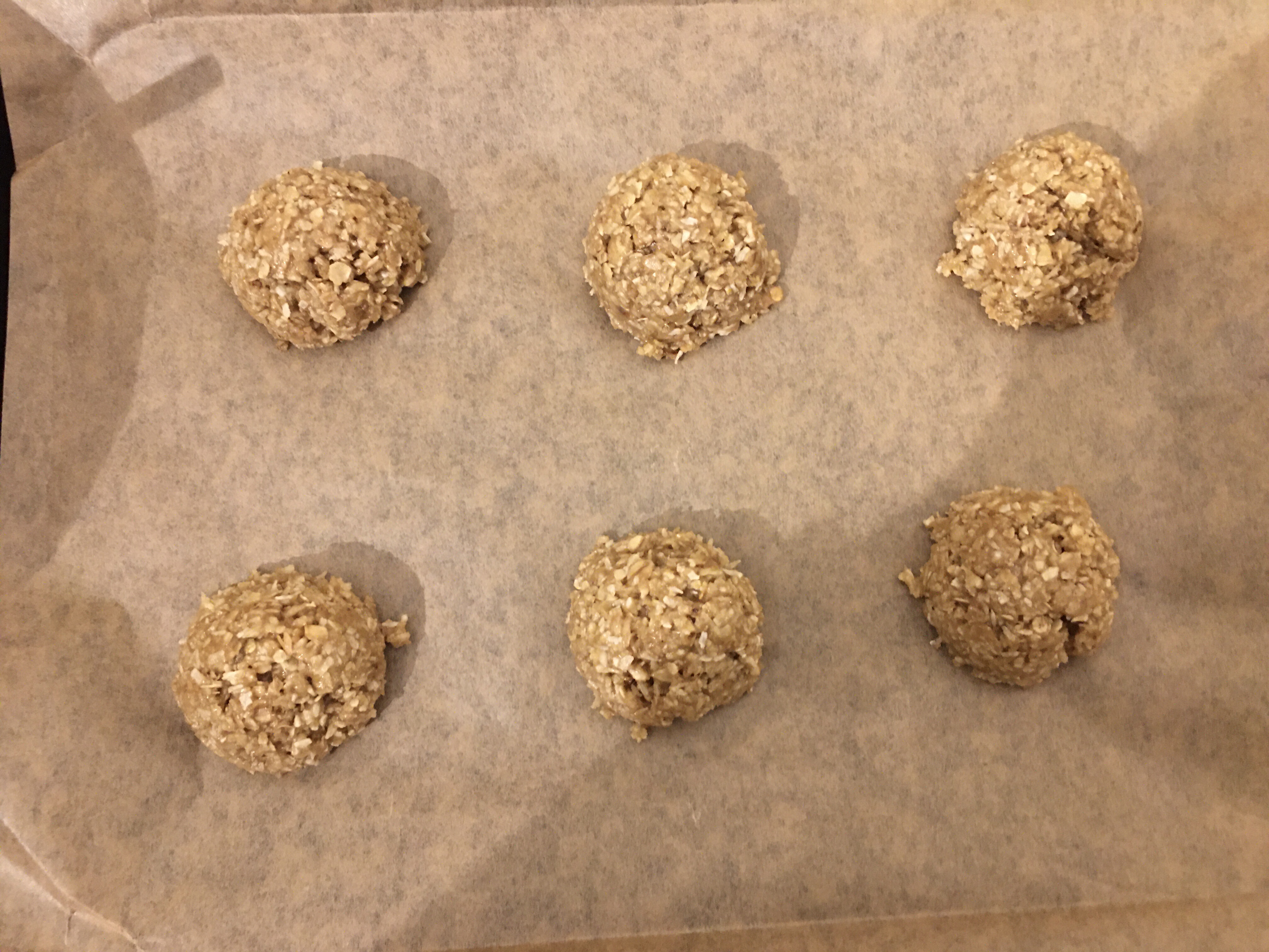 4. Roll spoonful by spoonful of mixture, about the size of a walnut shell and place onto an oven try lined with baking paper. leaving space again between dollops to allow for spreading.