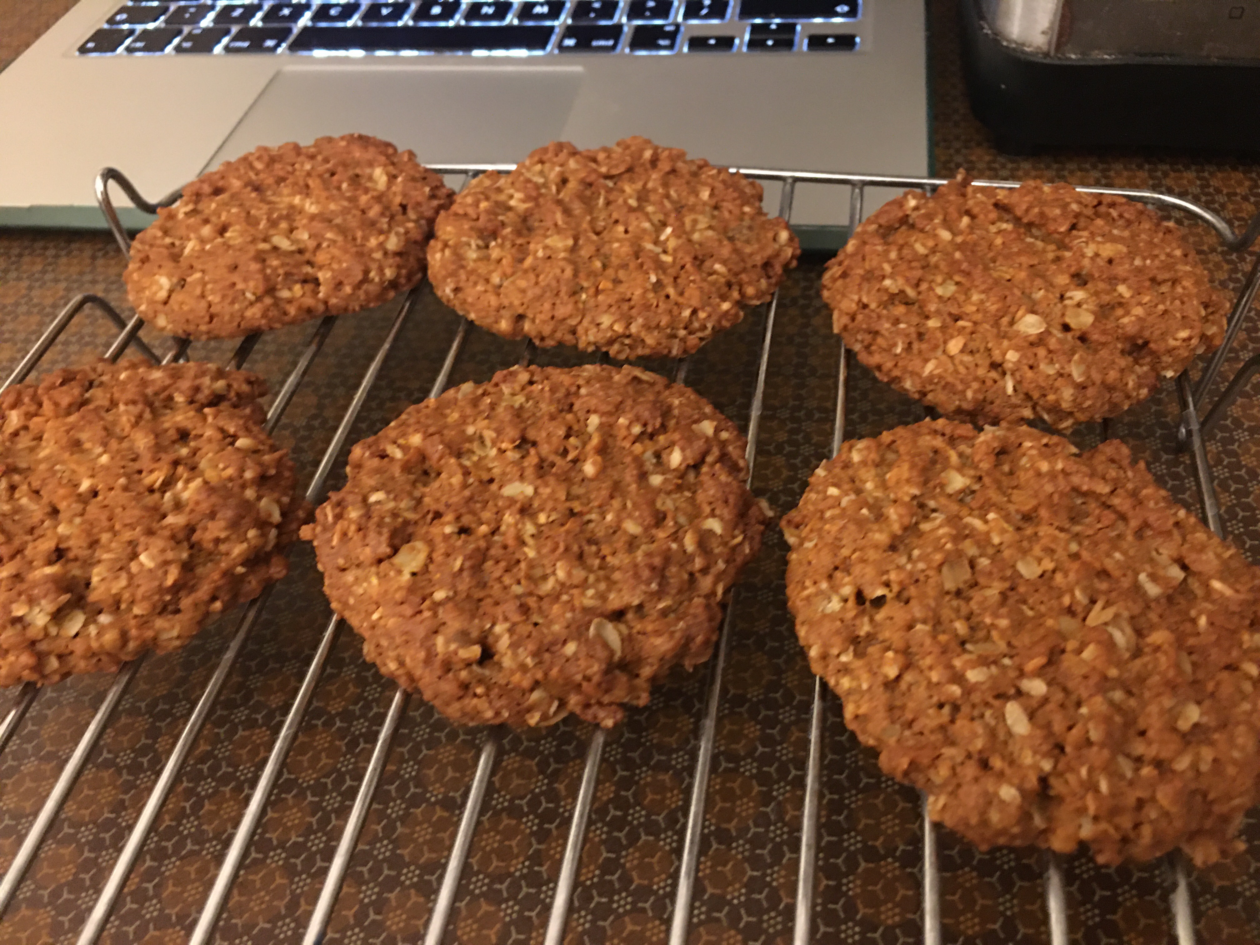 The beautiful thing about the Internet is that you get to ‘meet’ people that you might not otherwise have the opportunity to interact with in real life. I got a like on one of my posts, by a lovely lady called Angie, so as a good blogger does I headed over to Angie’s website and had a look at what she was writing about. It’s lovely to find another person who loves writing about the love of food. It’s inspirational. She has a lot of interesting recipes that I took notes on and decided to explore a few of them. The first one was Anzac biscuits, this piqued my interest because I have two unopened bags of desiccated coconut in my “pantry” that require ingestion! I also seem to have a lot of Scottish oats that also can’t be eaten faster than I have them for breakfast! A match made in foodie heaven.
