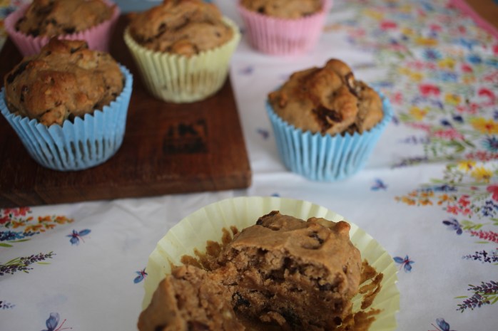 I had some bananas I’d been keeping all week for banana bread. I changed my mind and decided to revisit an old muffin recipe. This time I made a few alterations, added more dates (just to finish of the packet rather than having some left behind), I didn’t have crunchy peanut butter so I added 50g of crushed walnuts. I also decided I did not want to add sugar but changed my mind and added 2 tablespoons of black treacle.