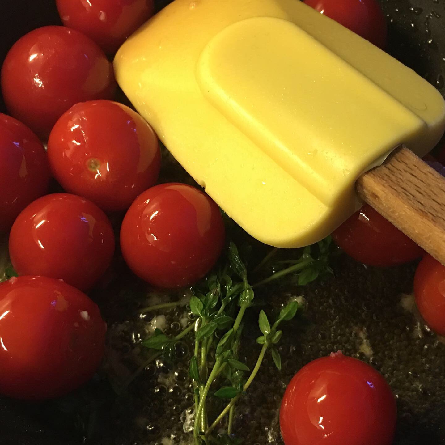 3. Place the cherry tomatoes in a frying pan with the remaining three tablespoons of olive oil, the thyme sprigs and the three other garlic cloves. Fry on a high heat until the tomatoes start exploding, then sprinkle the sugar. Remove the garlic cloves and thyme sprigs and pour the the tomatoes and oil onto the chickpeas.