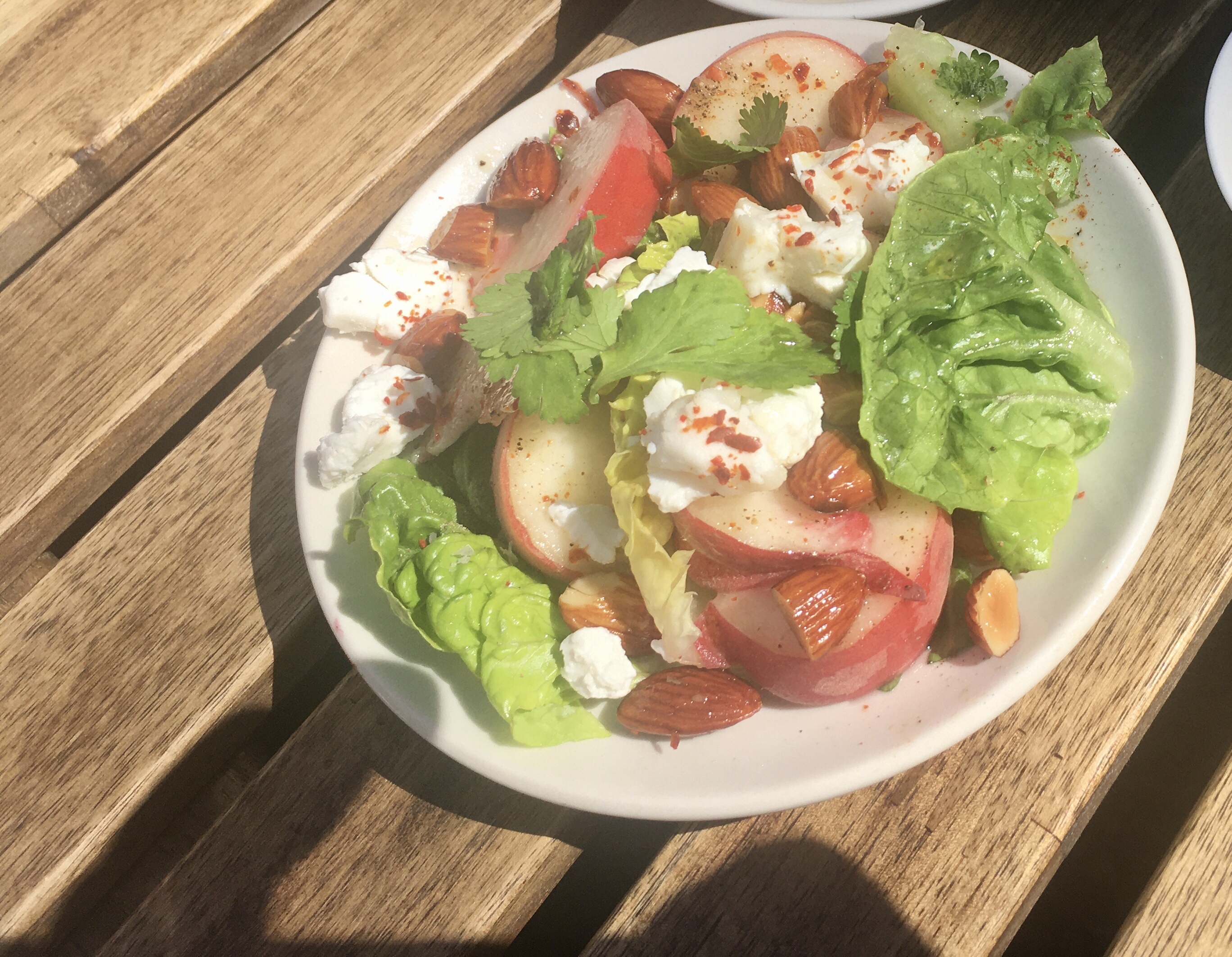 Flat white peach & goats’ cheese salad, almonds & orange blossom dressing Cheesy bouikos, house pickles, Kalamata olives, bread & olive oil