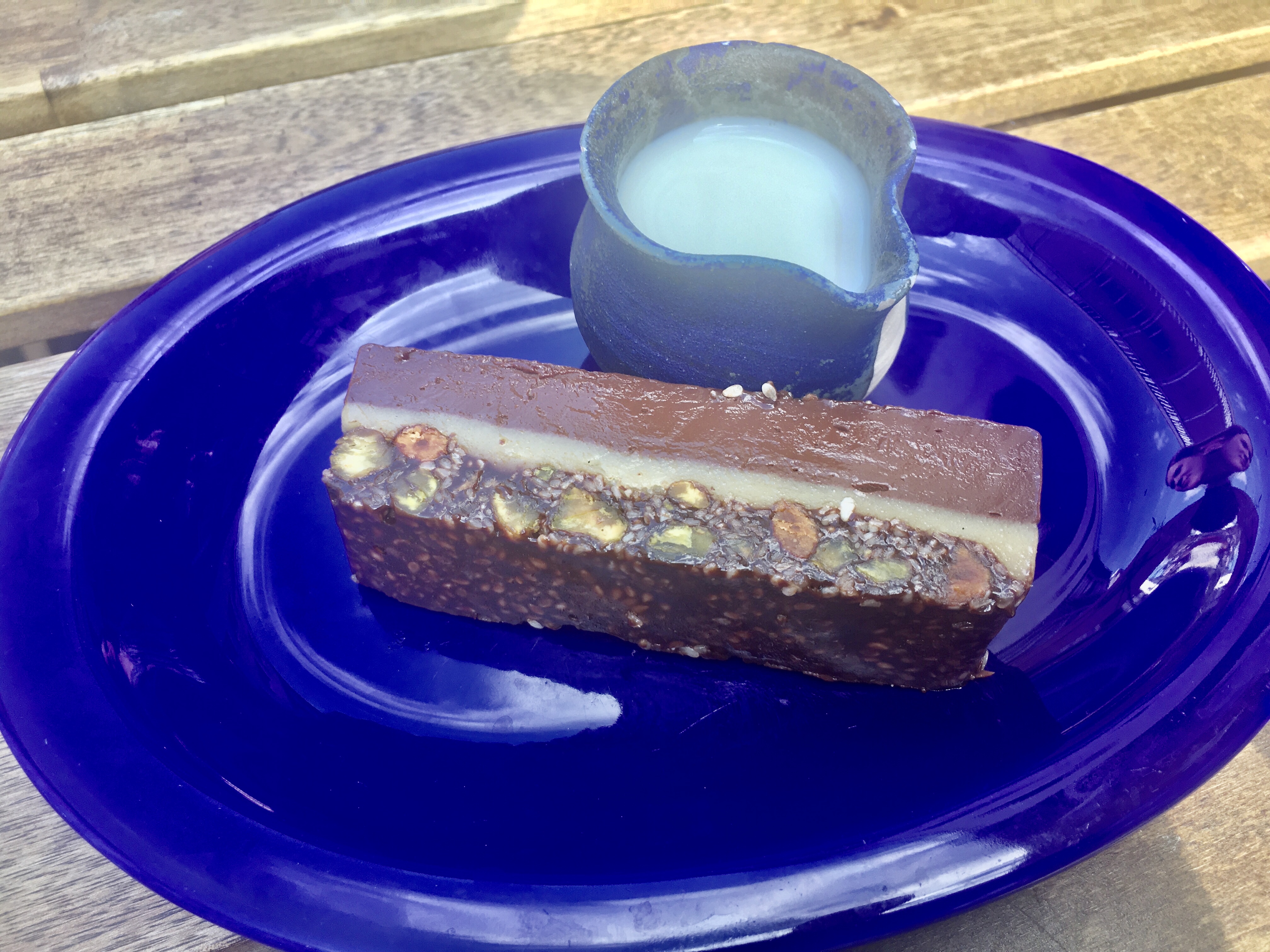 chocolate terrazzo cake (three layers of pure joy: chocolate, nuts & tahini) served with cold oat milk