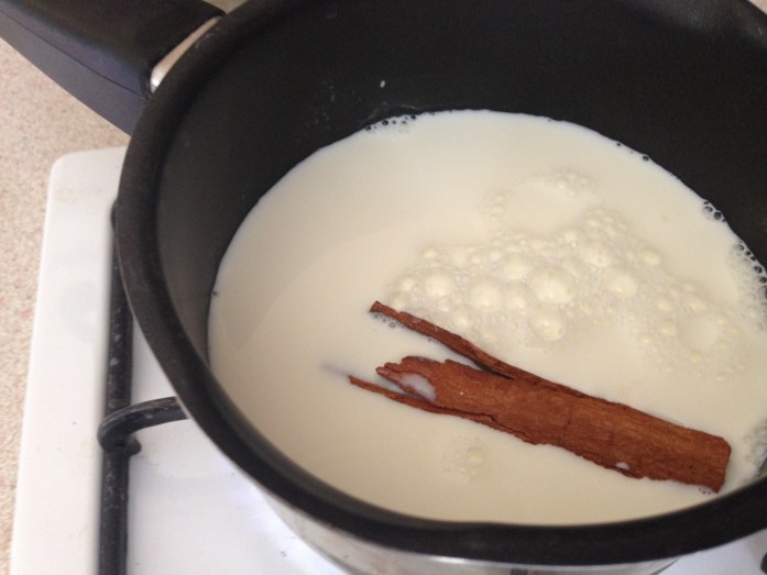 2 Put all the milk in a saucepan with the sugar and the cinnamon stick, bring to a boil. Turn off the heat the moment it starts to boil and leave to infuse for 5 minutes.