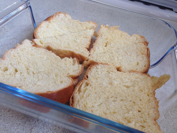 1 Cut the bread into 1 inch (2.5cm) slightly diagonal slices. Arrange them on a shallow dish that can hold the milk.