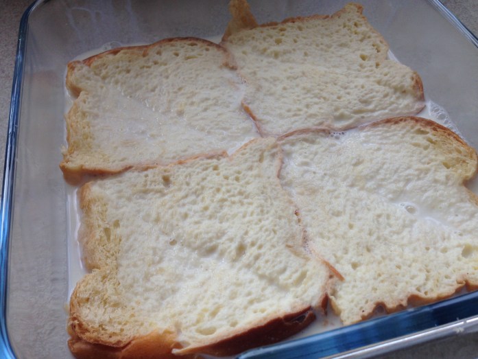I’m not quite sure what constitutes a bread with a ‘tight crumb’ but the only other loaf we had in the house was a brioche loaf. I thought that might just do. It did do. It did very well. Lovely soggy sweet inside with a little crunch on the outside. I missed out the sugar because I thought it would be sweet enough with the brioche loaf. But wonder if the sugar helps with a slight caramelised outside. Anyway – this was still very nice.