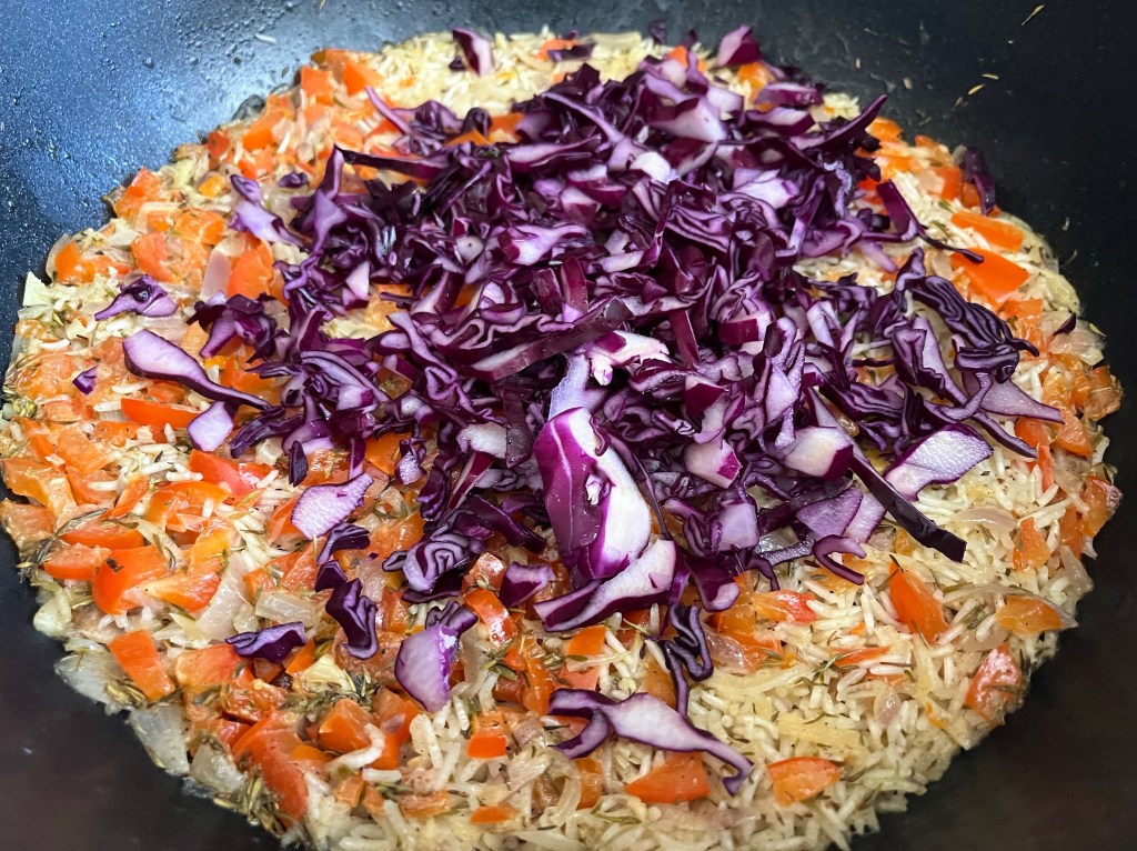 Meanwhile, finely shred the red cabbage; a mandolin helps. Reduce the heat again and place the red cabbage on top of the rice. Don’t store it in. Cook, covered, for a further 15 minutes.