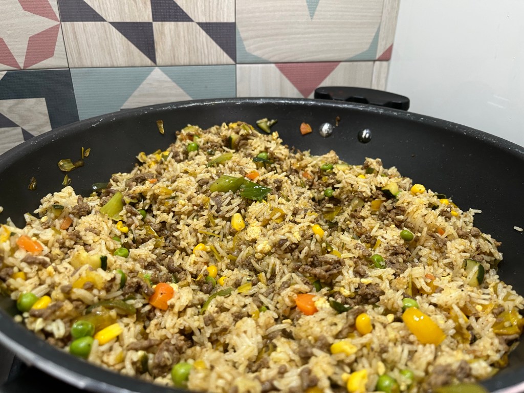 Boil some Basmati rice in vegetable stock, with diced carrots, peas and sweetcorn.