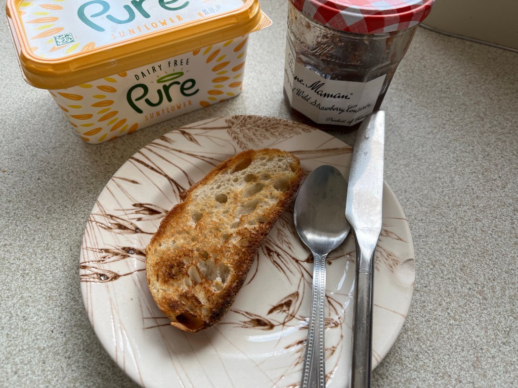 It’s certainly not breaking news 📰 by any standards, but I ate breakfast today! I’ve not felt like eating in the morning at all this past week. So today was a first. However that’s where the interest and excitement ends. The previous breakfasts were lovely pots of overnight oats and this morning – toast. Yes, plain old toast. I had another appointment at the GP surgery and afterward I popped into the Tesco express close by to buy a fresh loaf of bread 🍞. It must have not long been out of the oven because it was still warm, pleasantly soft and springy. Surely this must be one of life’s pleasures.
