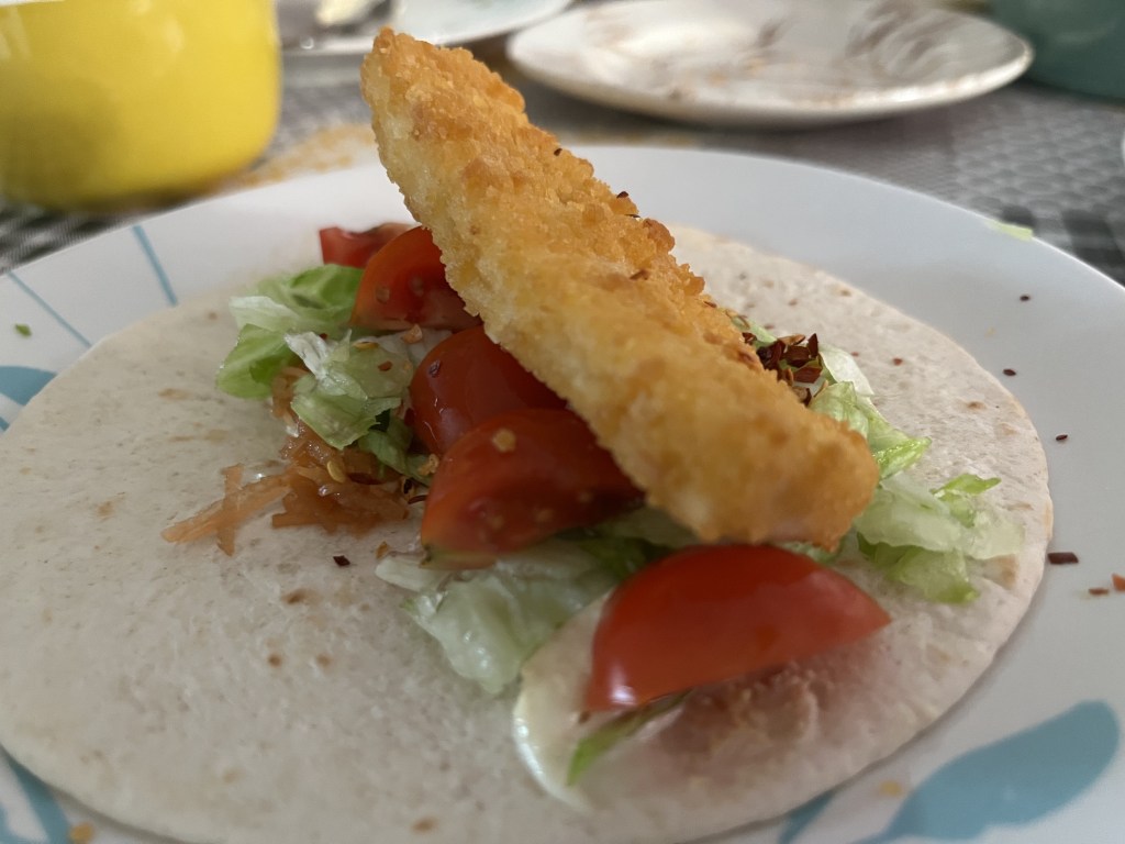 I chopped and grated some vegetables, baked some fish fingers and air-fried some tacos and voila – fish finger tacos.