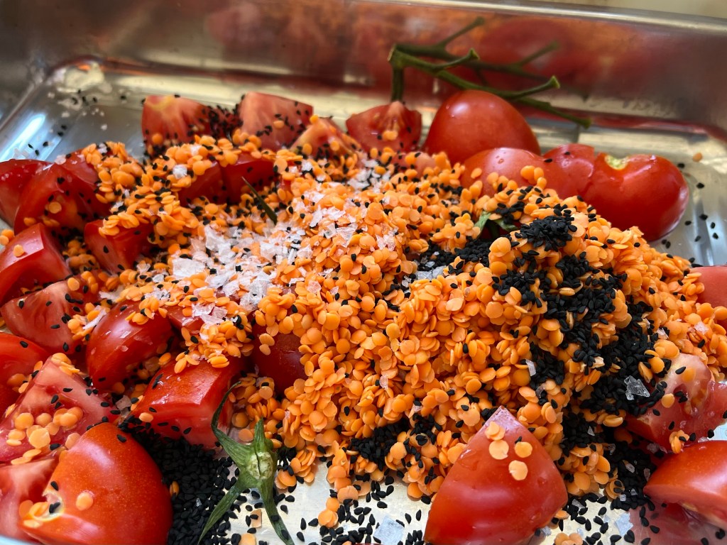 Preheat the oven to 200oC fan/200oC/gas 7. Tip the cherry tomatoes and their vines into a small lidded casserole dish or roasting tin, then add the lentils, nigella seeds, boiling water and salt (if using). Prod with a spoon to make sure the vines are submerged in the water.