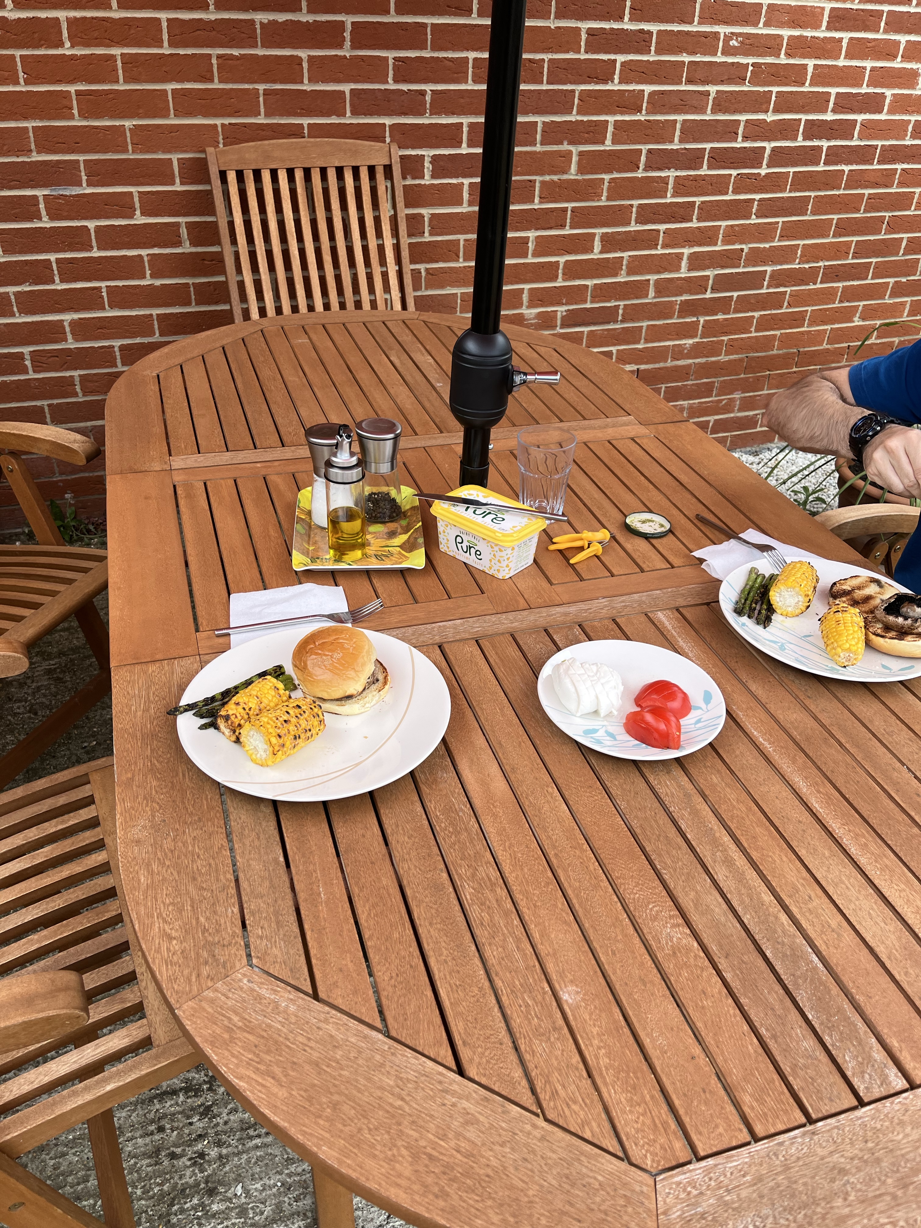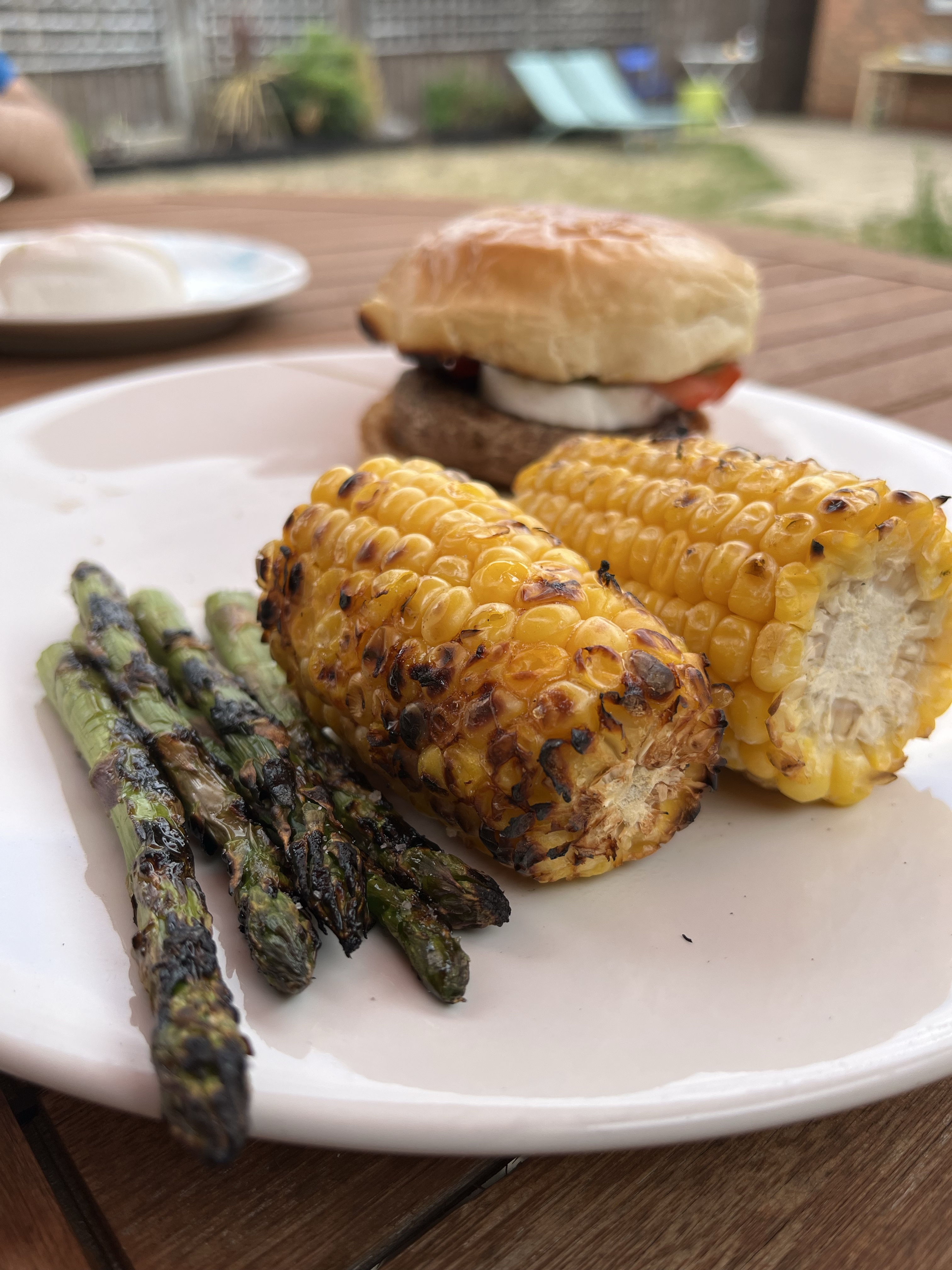 We bought some Portebello mushrooms, asaparagus and mozzarella. We used up the sweetcorn, brioche buns, tomatoes and pesto that we had in the house. The whole combination was unusual and surpisingly tasty. I am not sure that it would have adequately fed ‘the hungry masses’ had they been present, but it certainly went down well with us, in the summer sunshine, with Fela Kuti playing along in the background.