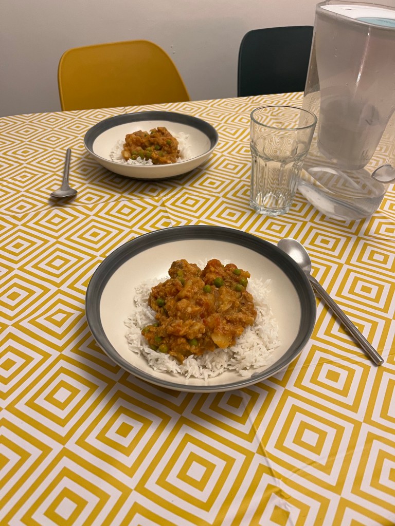 Not today, Sunday 8th January 2023. I showered and washed my natural afro hair. I cleaned the washing machine and put in a load of clothes still sitting in the laundry basket from our holiday. I made myself a cup of coffee and sliced up what was left of the chocolate panettone. Then I did sit on the sofa, put the TV on and thought about what I was going to make for dinner. While I was in bed earlier in the morning, scrolling through my emails I had come across a recipe for spinach, chickpea and potatoes. It looked fairly easy and I thought that I had most of the ingredients. Turns out I didn’t have either spinach or chickpeas! So I substituted with frozen peas and a pack of Alaskan pollock that I had in the freezer.