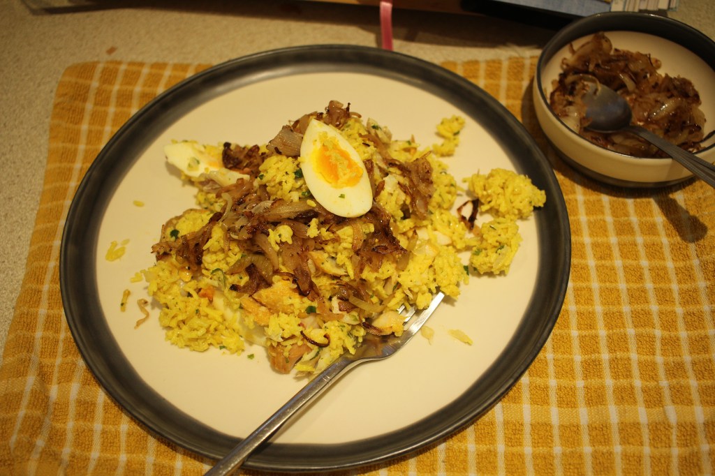 I’ve made this dish plenty of times before, but never with crispy onions on the top. Turns out they were quite the perfect addition. Also I think I might add that to my culinary repertoire, just so nice! In the evening when Ignacio came home I warmed up his portion for him and I made myself a cheese, roasted pepper bagel with added crispy onions, yup, bagel 🥯 heaven. There are two more containers of this kedgeree left in the fridge, which will make for some easy meals over then next 24 hours.