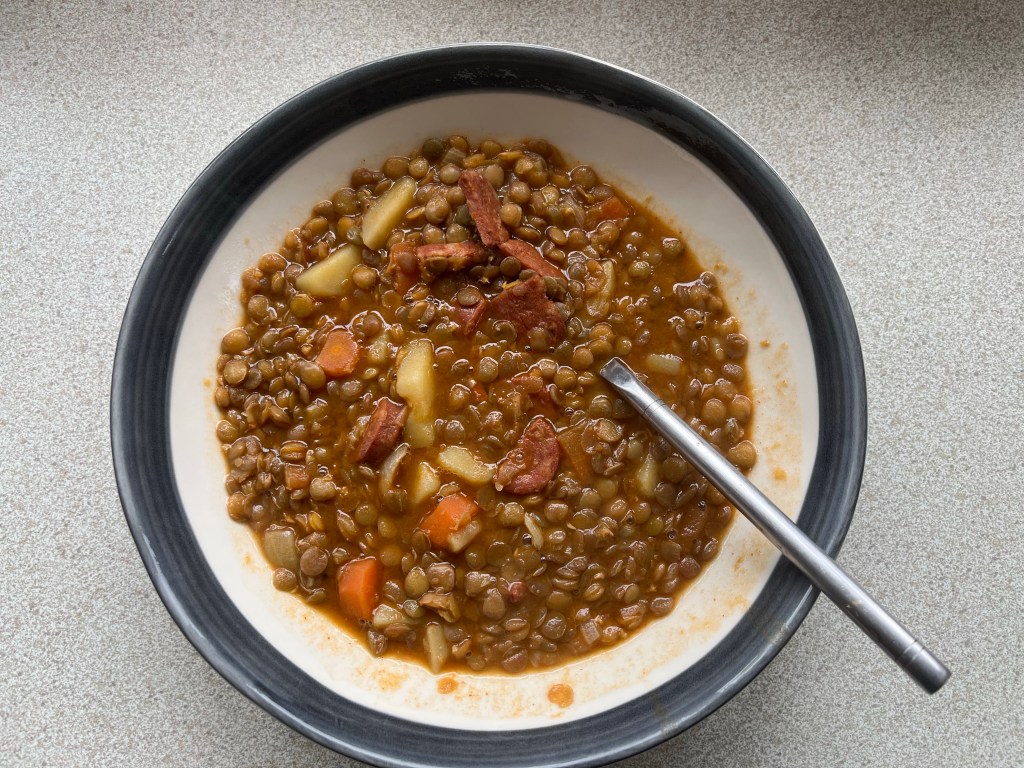 Fry onions in a pan with olive oil until slightly browned, then add Spanish paprika and cook for a minute. Add onions to the pot of lentils. Cook for 45 minutes.