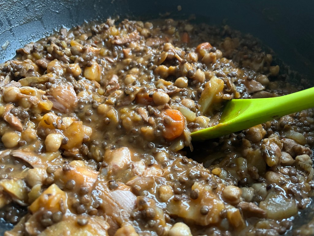 While that was happening, I chopped up another onion and sautéed that in 2 tablespoons of coconut oil. When the onions where translucent I mixed in a teaspoon of ras el hanout and let that cook for a few minutes, stirring occasionally so that the onions didn’t burn and stick to the the pot. I also chopped up one potato (skin on) and one carrot (peeled), I drained and rinsed one can of chickpeas and I had a tub of cooked Beluga lentils. All of these were going to form the bulk of my stew.