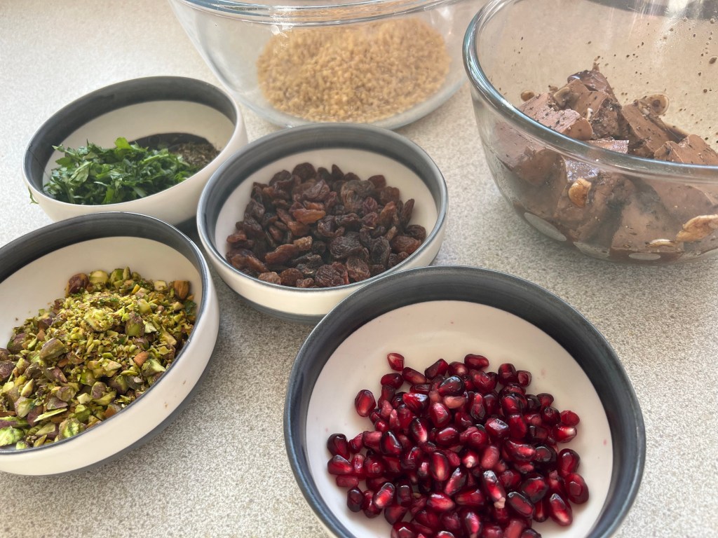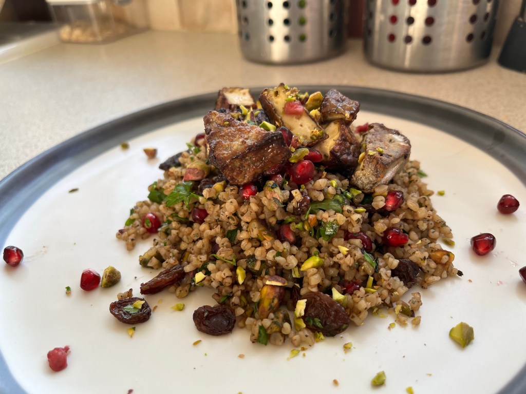 I decided to get out my Honey & Co recipe book and find something interesting to cook. I landed on pomegranate molasses chicken with bulgar wheat salad. I decided that I was going to replace the chicken with tofu. Why? I wanted to try something different. I wanted to use up the blocks of Tofu that I had impulsively bought at my last Costco shop.