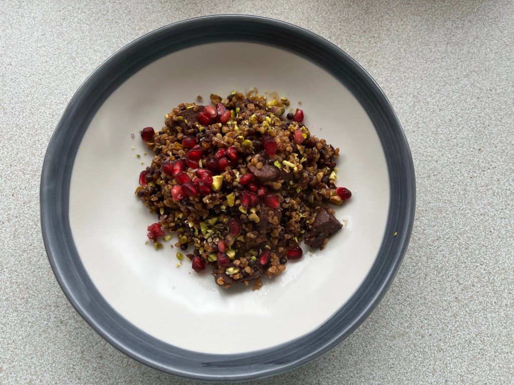 - Top with chopped pistachio nuts and pomegranate seeds.
