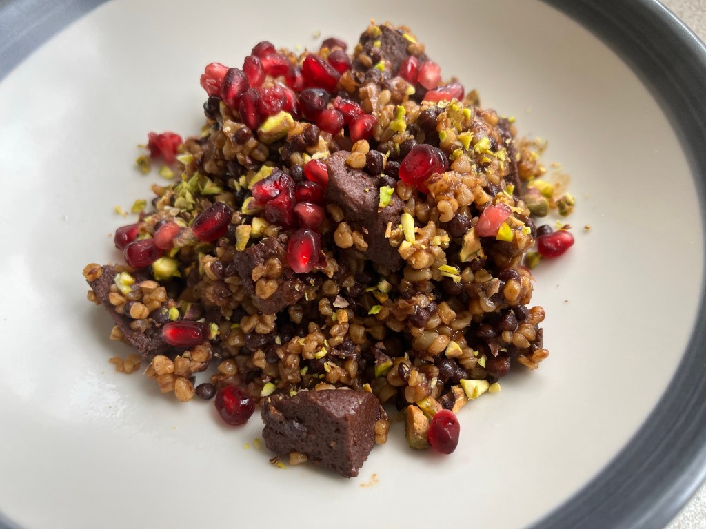 - Chop the tofu into cubes and mix into the pomegranate molasses, pepper and garlic marinade.
