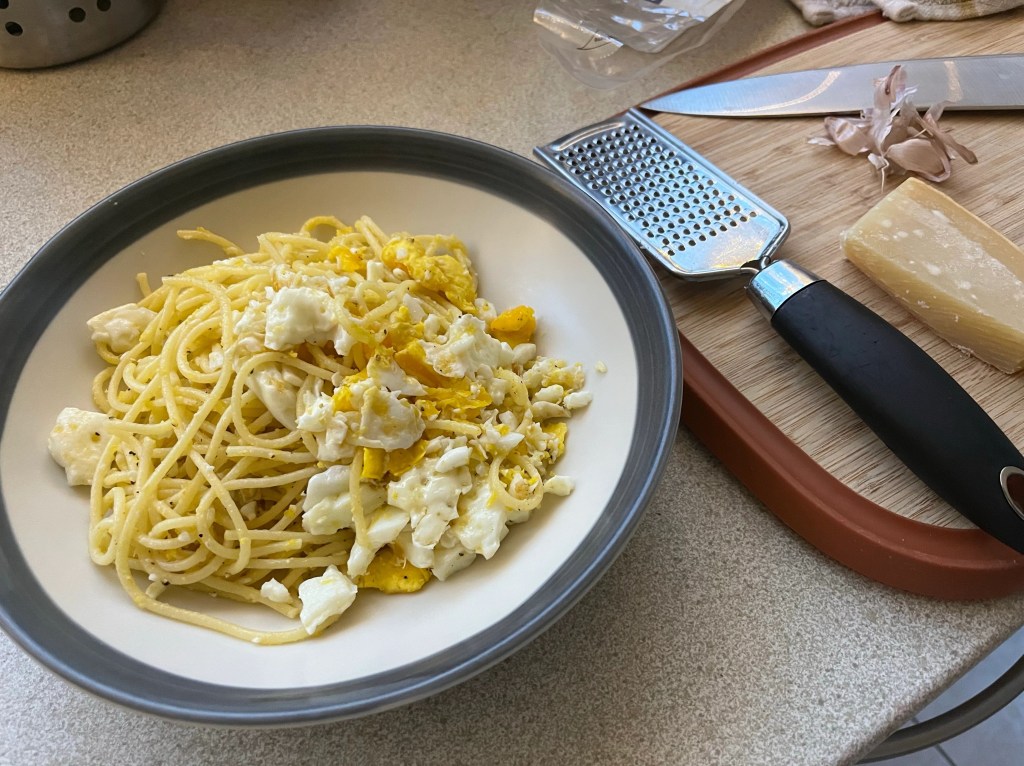 It turned out to be quite enjoyable to eat but a bit of a faff to make in the end because I was not careful enough with the timing of boiling the pasta and frying the eggs but it all worked out in the end. I think I will know what to do next time – and there will most certainly be a next time and variation on this.