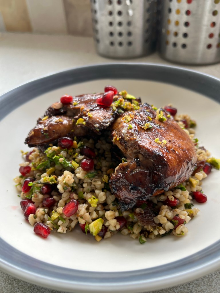 This Wednesday, working from home I made pomegranate molasses chicken with bulgar wheat salad. It was very easy to prep and tasted delicious.