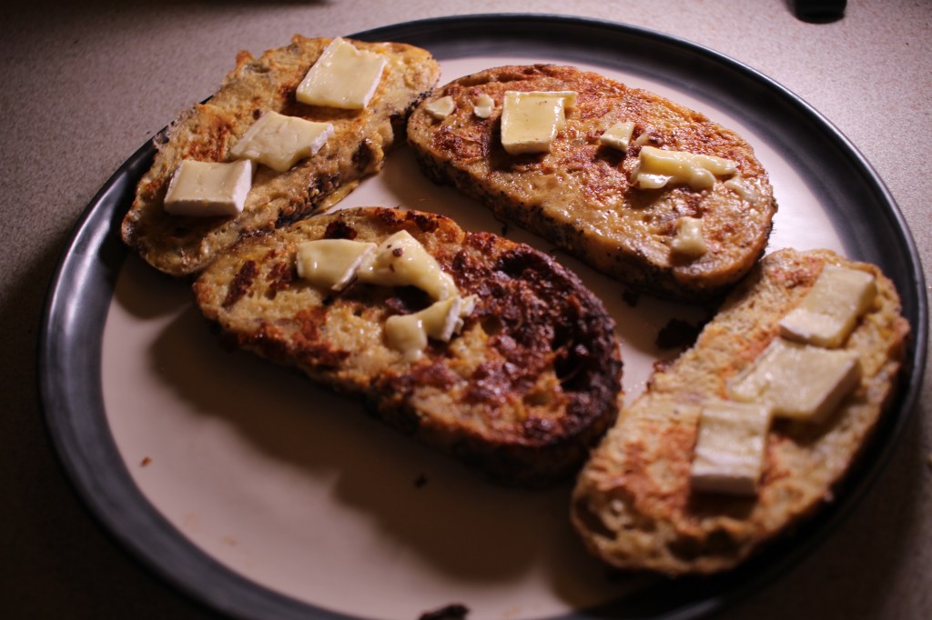 However, I soon discovered that didn’t really have all of the ingredients – no mayonnaise and no grateable cheese! In this recipe from Olia , slightly stale slices of bread are rubbed with garlic, soaked in a beaten egg mixture, then pan-fried in butter until golden and set. Then served warm with a bit of mayonnaise and shredded Gouda cheese. Sounds wonderful doesn’t it?