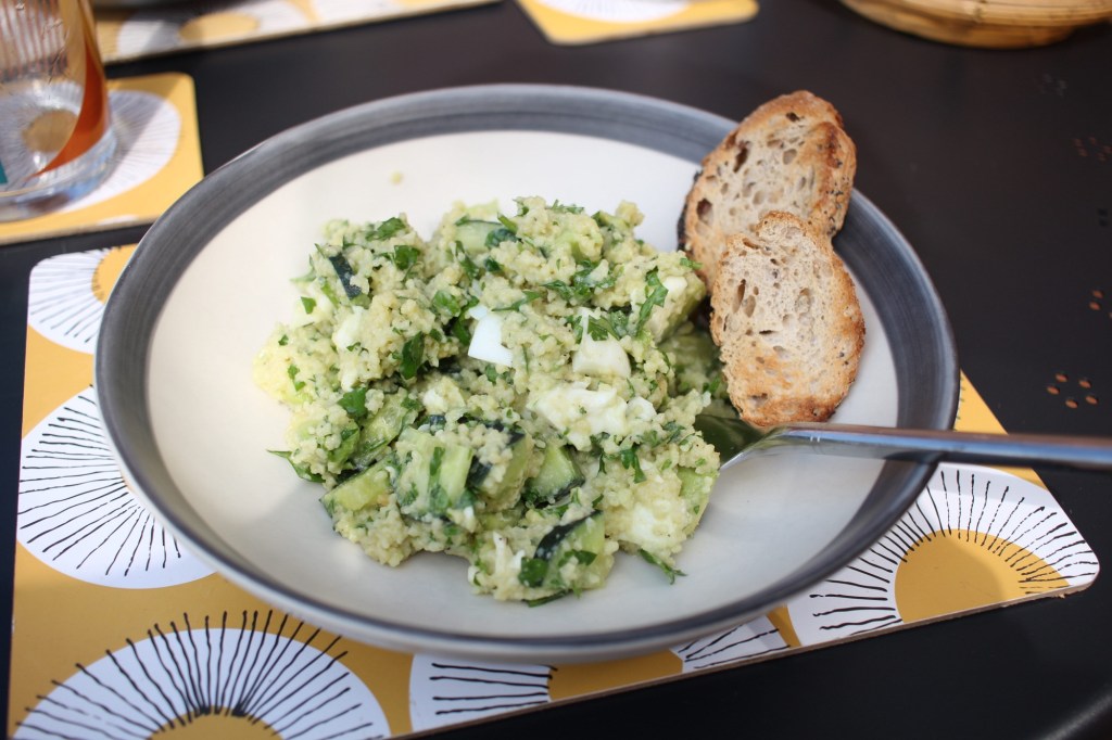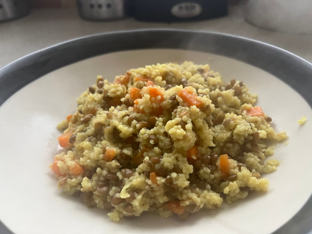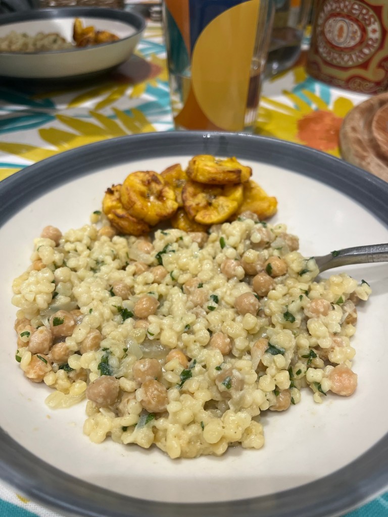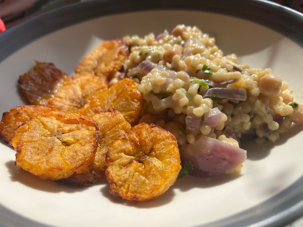 Three jars full…Giant cous cous and chickpeas with air fried plantain Cous cous and carrotsGiant cous cous and chickpeas and airfried plantain Cous cous in salad with cucumber 🥒 , avocado 🥑 , boiled eggs 🥚 , mozzarella and parsley 🌿 Cous cous and chickpeas with carrots 🥕, peas 🫛 and spinach