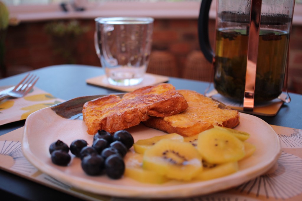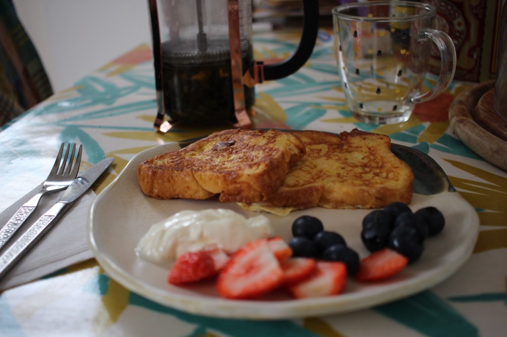 It should have been a relaxed start to the weekend. However, I had another hospital appointment to get to and I needed to fast for 6 hours before. Therefore there was no breakfast for me. I went to hospital, lay in a scanner for however many minutes and used my breathing exercises and mindfulness techniques to get through it all. I was planning a romanticized brunch at whatever local cafe their might be by the hospital. However, as I sat in my car in the carpark Googling places to eat, I just felt this overwhelming desire to get back to my own home and enjoy the peace of my humble abode. So I raced away and made myself the brunch I wanted – cardamom doughnut brioche french toasts with blueberries and kiwi fruit.