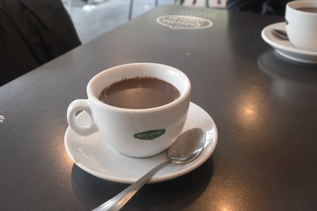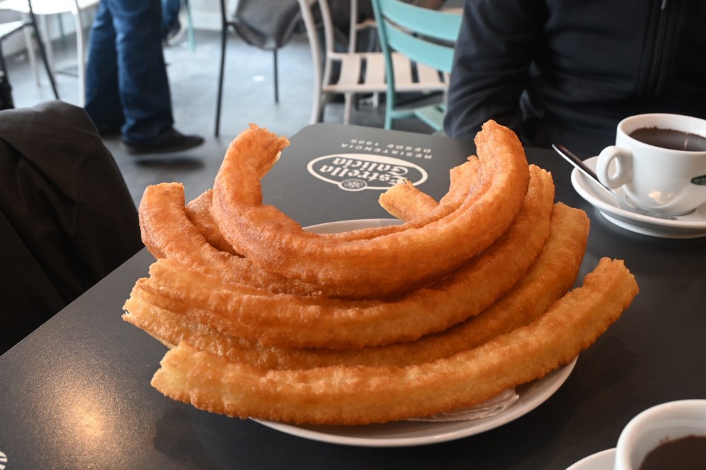 For the uninitiated, porras are the thicker, fluffier cousin of the churro. While churros are made from a unleavened dough – giving them that familiar dense, chewy bite – porras use a leavened dough with a raising agent, which makes them gloriously puffy and soft on the inside while still achieving that satisfying crispy exterior. They are best eaten the classic way: dunked generously and repeatedly into a cup of chocolate a la taza – a thick, dark, almost pudding-like Spanish hot chocolate that is nothing like the watery stuff we get at home. The combination is one of life’s perfections.