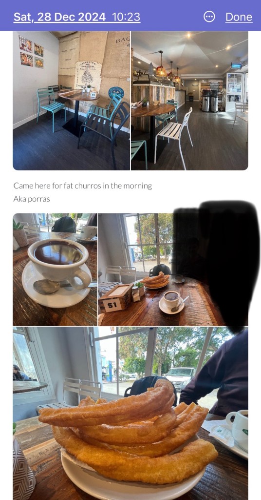 On day five, we ventured to Trastienda, a local cafe, for what and I affectionately call “fat churros” my slightly irreverent nickname for porras which has just stuck. It did not disappoint. The porras arrived golden and crisp, the chocolate thick and deeply rich, and we ate them slowly, pulling apart the dough and letting it soak up the chocolate before each bite.